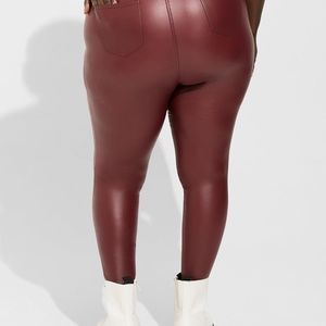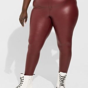 Torrid's highly rated and expertly designed legging - BUT MAKE HER BUTTERY VEGAN LEATHER - has a stretch waistband that holds you in with a tummy-smoothing effect. Goodbye muffin-top! Comfortable, liquid feel with an edgy finish. The rear pockets, faux front fly and pocket detailing give you the feel of a trouser with the ease of an activewear bottom.