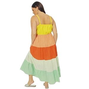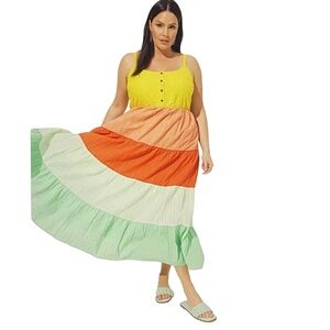 This cheerful 2023 Torrid maxi is crafted in a lightweight seersucker-style challis fabric and features playful tiered stripes in sunny yellow, melon, coral, and mint. The bodice includes buttons and a smocked back for comfort and ease of fit. Side pockets and full lining make it as practical as it is breezy. Whether you’re headed to a beachside brunch or just love bold, colourful staples, this one’s a standout.