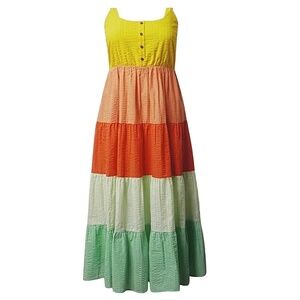 KEYWORDS: Torrid seersucker maxi, striped sundress, colourblock boho dress, vacation style, 2023 maxi dress, bold summer layers, smocked back dress, plus size friendly, tiered ruffle skirt, resortwear