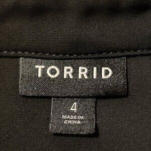 Hailing from the brand Torrid, this black blouse is lightweight, minutely stretchy, has functional pockets, and is comprised of 100% polyester.