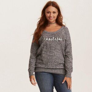 TORRID Sequin "Beautiful" Raglan Grey Cotton Sweater Size 1