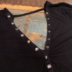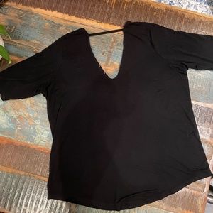 Super Soft construction makes this basic tee a daily favourite, complete with a snap button detail on the neckline, elbow-length sleeves and a flattering v-back strap. Reveal as much or a little as you want with the wide v-neck of this super soft closet staple.