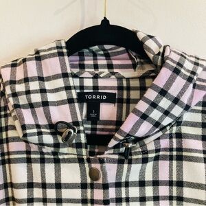 TORRID Sz 1 Flannel Plaid Hooded Drawstring at Waist Snap Buttons Anorak Shacket