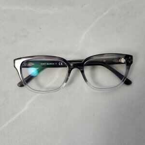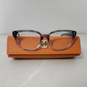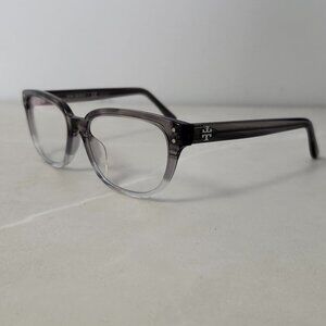 Tory Burch grey translucent eyeglasses frames. Tory Burch logo on the side. Has prescription lenses that will need to be replaced. Comes with glasses case and cloth still in its package.