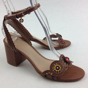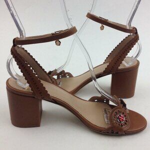 Show off a fresh pedi in this block-heel leather sandal with a pretty scalloped strap brightened with floral embellishments.