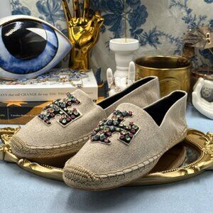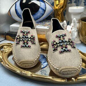 🆕 TORY BURCH 🧿 NWOB Ines Linen & Leather Bejewelled Espadrilles - Sz 10 M