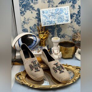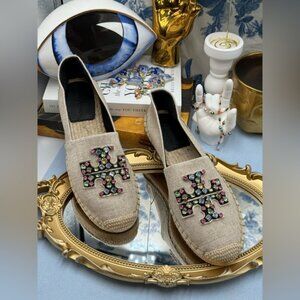 🆕 TORY BURCH 🧿 NWOB Ines Linen & Leather Bejewelled Espadrilles - Sz 8 M