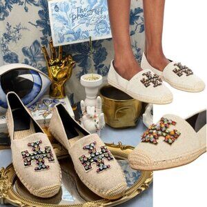 🆕 TORY BURCH 🧿 NWOB Ines Linen & Leather Bejewelled Espadrilles - Sz 9 M