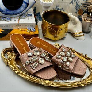 🆕 TORY BURCH 🧿 NWOT Martine 25mm Slides, Pink Croc Embossed Crystal, Sz 7