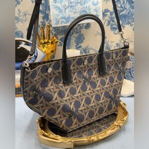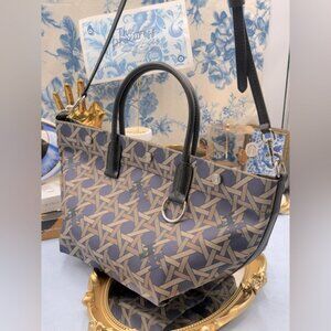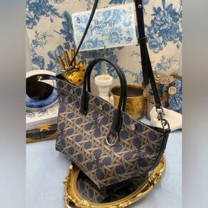 🆕 TORY BURCH 🧿 NWOT Small Basketweave Tote Bag, Cotton Canvas & Leather - AUTH