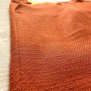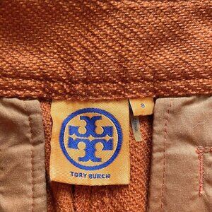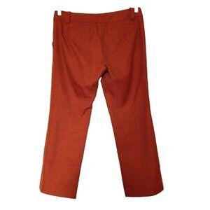 TORY BURCH RUSTY ORANGE TEXTURED STRAIGHT LEG TROUSERS PANT STYLE 51111218, This is a dark rusty orange mid- rise straight leg trouser pants featuring a zipper fly, 2 hook & barre closure- belt closure - has stretch for a comfy feature on thic thick cotton / corduroy-like textured fabroc slash pockets. Perfect casual tu business casual to business look with a coordinated blazer and a button down shirt - chunky loafers for a trendy touch.