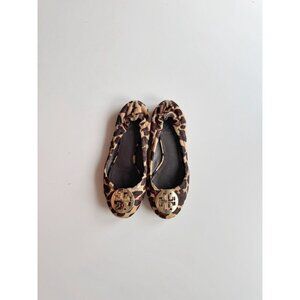 TORY BURCH Reva Leopard Calf Hair Leather Gold Medallion Ballet Flats, Size 9