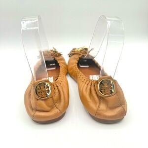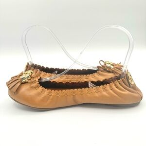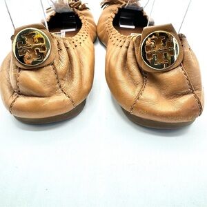 [Meta: Tory Burch tan flat ballerina nude loafers with tassel design and gold hardware. Size 6.5, signs of wear on leather but gold hardware remains bright. Overall in amazing condition.]