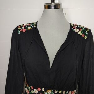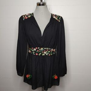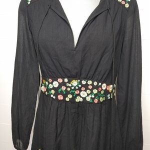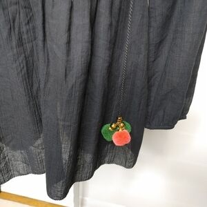 Beautiful gauzy tunic blouse with floral embroidery and adorable pompom tassels that have little Jingle bells for a total bohemian vibe. cotton/linen blend. Hidden size zipper closure. In excellent condition. upper front bodice area is lined.