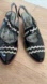 Tour En Ville closed pointy toe sling back heels. Adjustable velcro straps across instep. Black patent leather with cream colour geometric design. 2" block heel. Rubber sole.