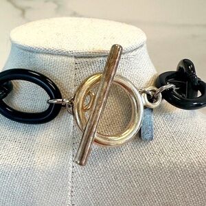 Fun TOVA black-coated metal link necklace. Perfect year-round! Note some discoloration/tarnishing on metal toggle clasp worn at back of neck as shown in photos - no other issues.