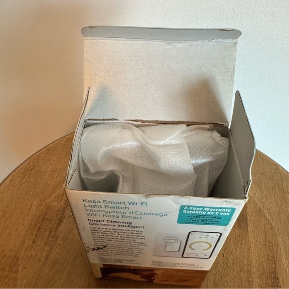 tp-link Kasa smart wifi light switch dimmer. This dimmer is white and can connect to your phone, Amazon Alexa or Google Assistant to turn on/off/dim. The unit has never been installed and comes in the open box with plastic protective wrap still attached to the switch plate. The instructions are also included. The box is damaged and has some pen, marker and other markings on it, which can be seen in the attached photos.