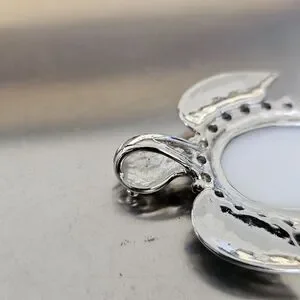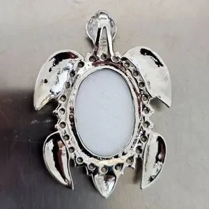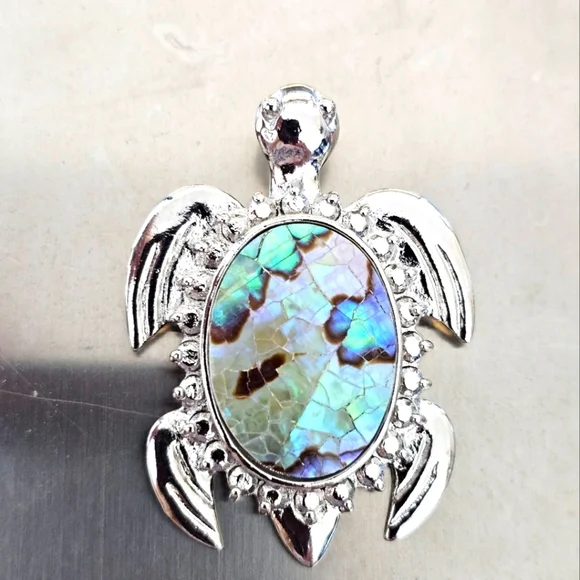 The Abalone shell shows natural cracks on the surface. The setting is a bezel oval shaped in a sea turtle. Could be worn on a chain or cord (not included) or could possible be made into a beautiful brooch.