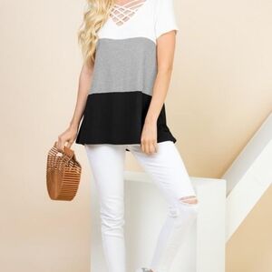 Short Sleeve Color Block Criss Cross Neck Top ....lightweight material and Soft