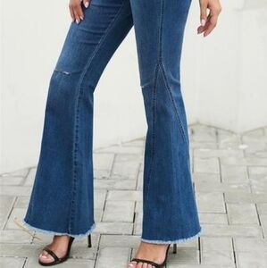 Elastic at the waist that stretch and move for the utmost wearability The statement bell bottom fit create a retro look on these bottoms You can never go wrong with a medium wash and high rise fit The raw distressed hem and light distressing are added details we adore Wholesale jeans are super comfortable and flattering