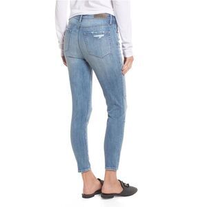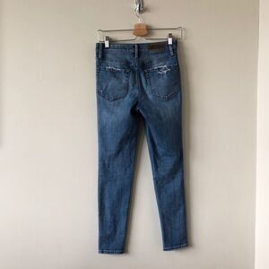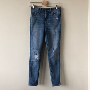 Heavy fading and distressing perfectly age these high-rise stretch-denim skinnies that look and feel like you've loved them for years.