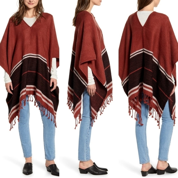 Swingy fringe trims a boho-style poncho that's a perfect layering piece for brisk days—and don't forget to take it with you on your next flight.