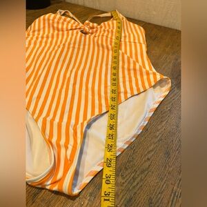 Flattering one-piece swimsuit with bold vertical stripes in yellow and white. Features a front twist knot detail with keyhole opening, and a dramatic open back with adjustable crisscross straps. Built-in cups for support. Size 18.