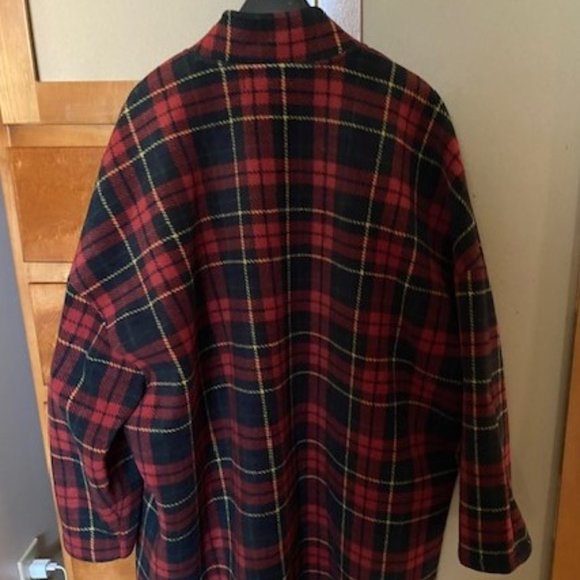 Gorgeous red plaid. Very comfy coat with side pockets and one front snap. Too small post pandemic!