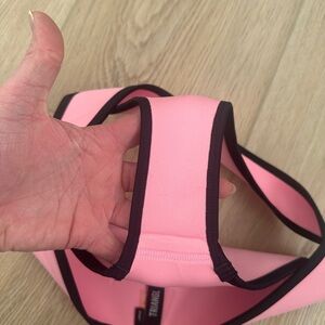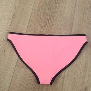 Stylish pink swimwear bottom with black trim. Perfect for beach days.