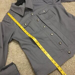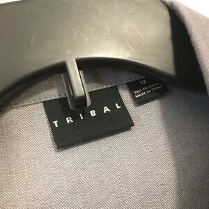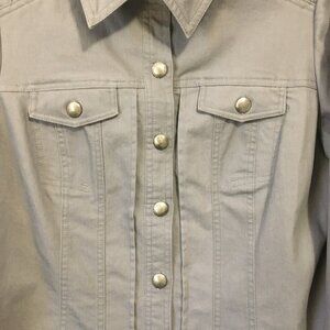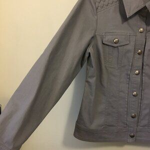 Very good condition, clay-grey (almost with a lavender tint) button down jean jacket with braided shoulders by Tribal. A fantastic Canadian-based brand. Loved throughout the 70s and still delivers the same high quality pieces today.