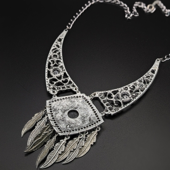 tribal, feather, dangles, accent, black rhinestone, pewter finish, metal, grunge, effect, retro, style, statement necklace, costume jewelry, bohemian, breastplate, goth, emo