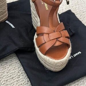 -PLATFORM ESPADRILLES SANDALS WITH INTERTWINING STRAPS MADE WITH METAL-FREE TANNED LEATHER, FEATURING A JUTE MIDSOLE AND ADJUSTABLE ANKLE STRAP ENGRAVED WITH SAINT LAURENT PARIS.