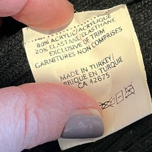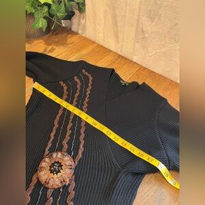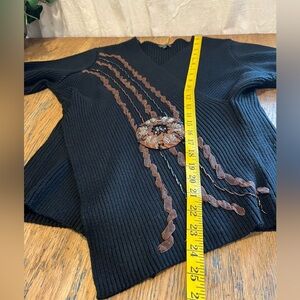 Chic and elegant black ribbed knit sweater with a flattering faux-wrap V neckline. Decorated with intricate bronze and copper-tone beads and embroidery, centered by a textured floral medallion. Stretchy, soft material with long sleeves and fitted silhouette. Tag reads size XL. Made of 80% acrylic and 20% elastane. Good condition.