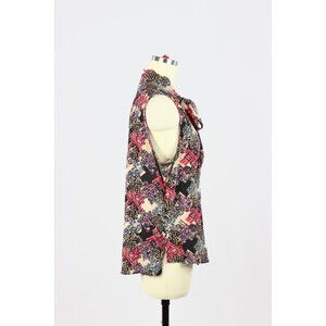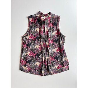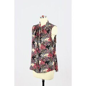 TRINA TURK Graphic Printed Silk Button Up Tie Neck Sleeveless Blouse, Size L