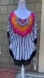 Stand out in this stunning boho-style poncho with a dramatic black fringe hem and bold feather-inspired print in vibrant fuchsia, orange, and multicolour accents. The circular cut creates an effortlessly draped silhouette, perfect as a festival look, beach cover-up, or artistic layering piece.