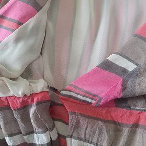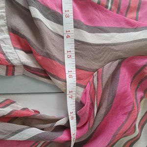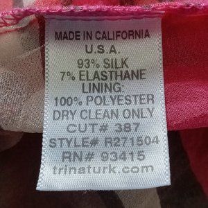 Trina Turk silk blouse. Wrap button closure. Unique bell sleeves that turn into the bottom of the blouse. Gently loved and in good condition. Small area on a seam that is coming undone (see photo).