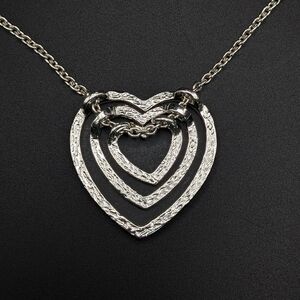 Triple Heart Necklace with Blue Crystal Pavé Accents in Silver Tone. 3 hanging hearts within one another, with beautiful blue crystal accents in a smooth silver toned metal. silver toned chain is 16" long, and pendant is 1.25" long. in beautiful preloved condition, with no notable signs of wear. silver tone is bright with no signs of plating loss. lobster clasp, with extension and tiny silver heart hangtag. costume jewelry.