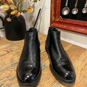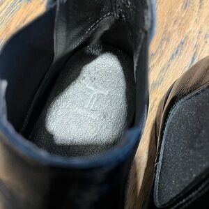 Elegant and versatile black Chelsea boots from Tristan. Made of genuine leather with a smooth, slightly glossy finish and elastic side panels for easy slip-on. Classic almond toe and low stacked heel. Excellent overall condition
