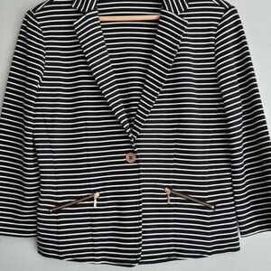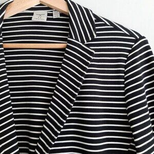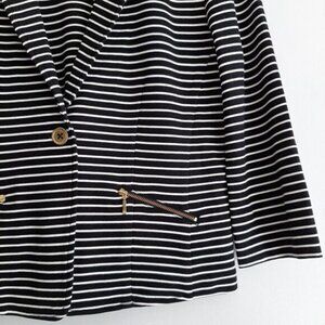 • Long 3/4 sleeve stretchy blazer in black and white striped pattern. Unlined with two front zip closure pockets.
