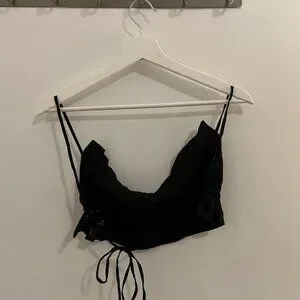 Super Trendy, Backless, Crop Top With Self Tie Strings In The Back And Ruffle Detailing Along The Top And Bottom! Perfect Top To Wear Casually In The Warmer Months, On Vacation, Going Out And In Your IG Posts!