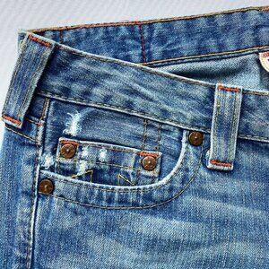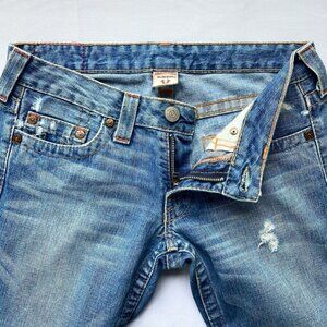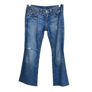 TRUE RELIGION BUDDHA BACK POCKET EMBROIDERY DISTRESSED FLARED RARE CROPPED JEANS