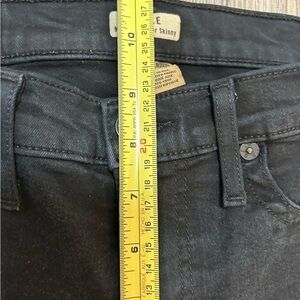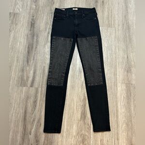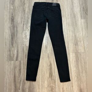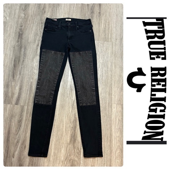 TRUE RELIGION Halle Mid rise super skinny black jeans with patches on thighs.