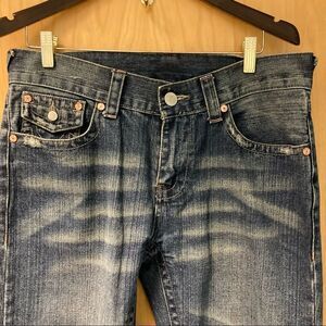 TRUE RELIGION Joey Distressed Wiskering Jeans w/ Embroidered Back Pocket Sz 32