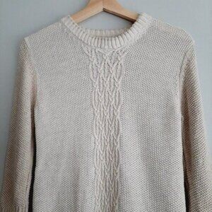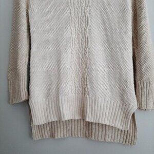 • Long sleeve crew neck hi-low hem knit pullover top in white and cream. Mid cable knit pattern.