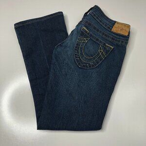 True Religion Lexi blue jeans in a slim bootcut style. A dark wash denim. Get that 90s Y2K look with these low rise style. The second photo with the two back pockets showing is a true representation of what the color is. In excellent used condition with no flaws. Inseam is 28”. Please see photos for measurements and details. Women’s size 25.