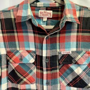 TRUE Religion red teal plaid check flannel fleece button down shirt size 8