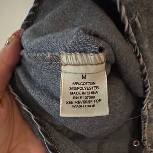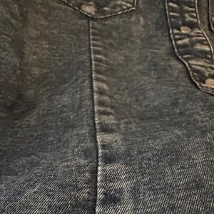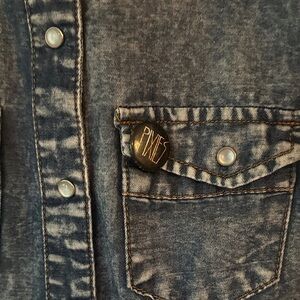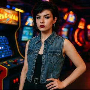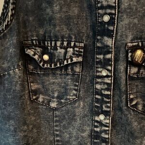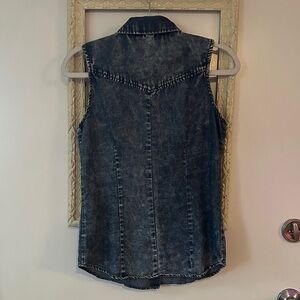 Stylish sleeveless denim shirt with button-up front. Features two chest pockets.