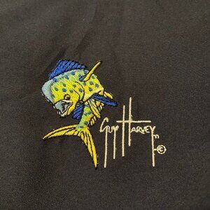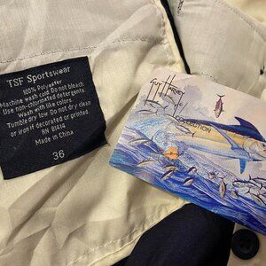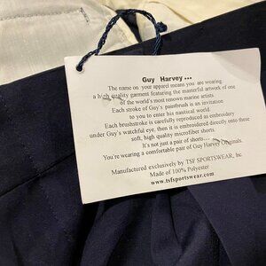 TSF Sportswear Men's Navy Pleated Guy Harvey Shorts - Size 36 - NWT. Two front pockets, two back pockets. Front zipper. 100% polyester. Actual measurements: Inseam: 8.5". Waist: 35". Front rise: 12".