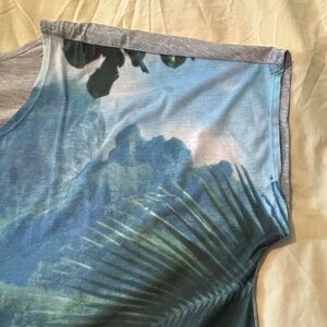 T-SHIRT, BEACH SCENE, SOFT GREY MIX (Blues/Greens/Greys), SIZE 5X, SHORT SLEEVES, RELAXED FIT, BRIGHT COLOURS, HIGH LOW HEM, PENNINGTONS, IN ORIGINAL BAG, NEVER WORN