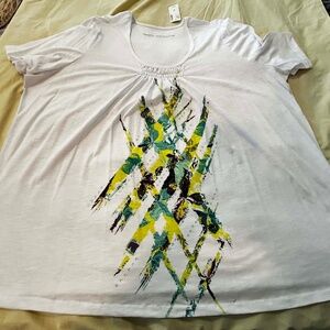 T-SHIRT, RUCHED NECK, WHITE WITH PRINT, SIZE 4X, GLASS SPARKLE ACCENTS, VEE NECK